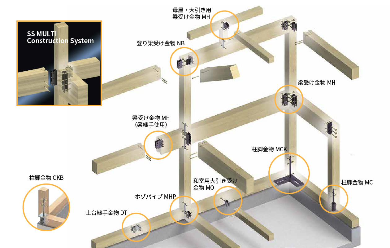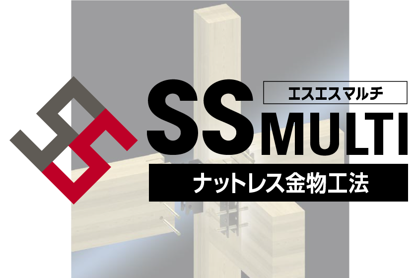 「SS MULTIナットレス金物工法」は、梁受け金物に転造ねじ加工を施しナット不要で金物取り付けができ、さらに3種類の梁受け金物を上下反転使用、組み合わせ使用により105~630mmの材成にご使用いただける画期的な金物工法です。