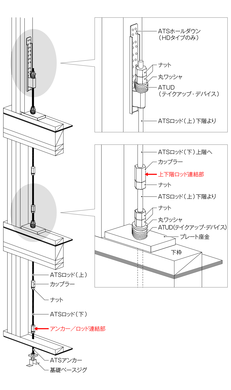 - ATSはロッド、カップラー、ナット、プレート座金、Tプレート、丸ワッシャ、ATUD、ATSホールダウン、アンカーボルト、基礎ベースジグで構成される金物本体とします。ATSを設置する際に必要となる補強たて枠、合板などの木材は含まれません。