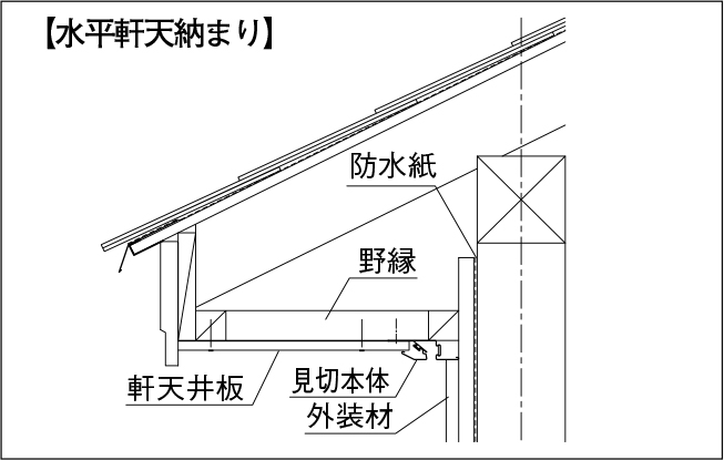 - 軒天井下地は通常の野縁組を使用可能。また、水平軒天井、勾配軒天井ともそのまま施工が可能で、仕上がりがきれいです。