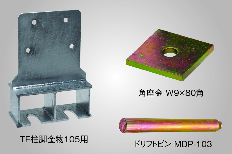 | 105-11S | WF101100 | TF補強鋼板105 2個 ビスTBF-30 140本 ラグスクリューL-300 11本 SW付丸座金 11枚 ドリフトピンMDP-103 6本 | TF柱脚金物105用 2個 ドリフトピンMDP-103 8本 角座金W9×80角 4枚 | MH-180 2個 中ボルトL-210 6本 SW付丸座金 6枚 | 33.7 |