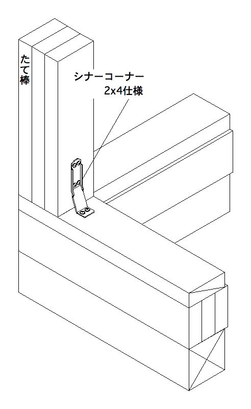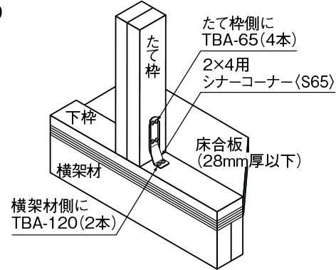 - 専用角ビットビスTBA-120を横架材側に2本、TBA-65をたて枠側に4本とめ付けてください。