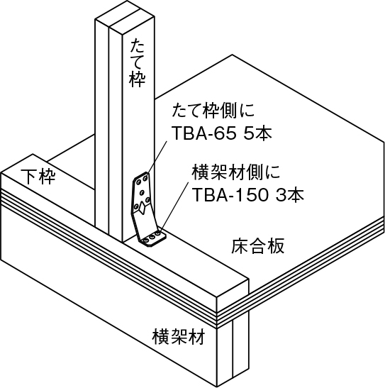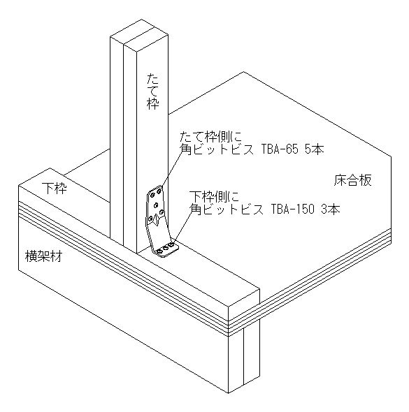 - 専用角ビットビスTBA-150を横架材側に3本、専用角ビットビスTBA-65をたて枠側に5本でとめ付けてください。