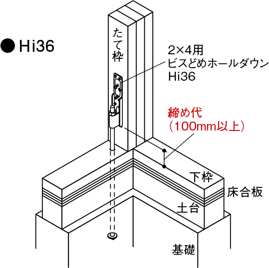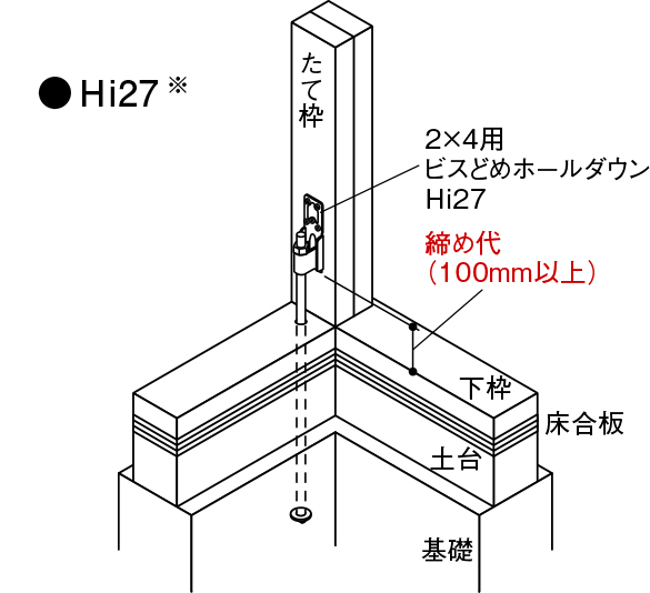 ※Hi27はたて枠2枚の箇所にも取り付けられます。下枠の天端から金物までの寸法(締め代)は100mm以上確保してください。