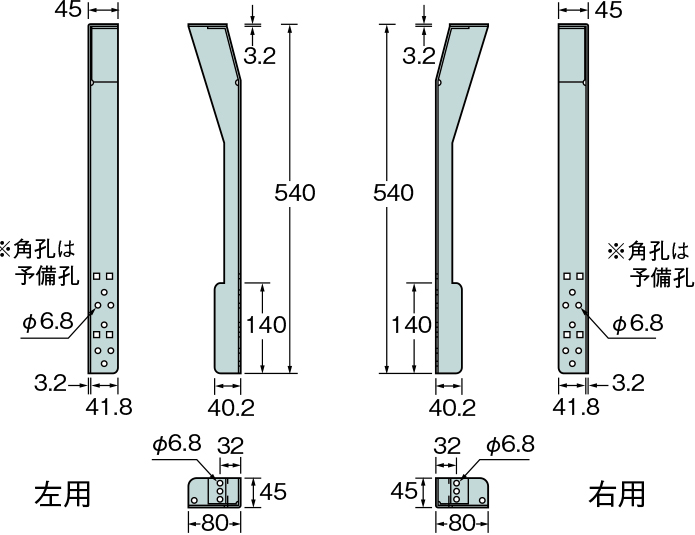 | 45×540×80×3. 2(t ) | AA154000 (AA1540R0(右用)) | 10個 (左右各5個) | 専用角ビットビス TBA- 65(70本) TB- 101(40本) | 12.4 |