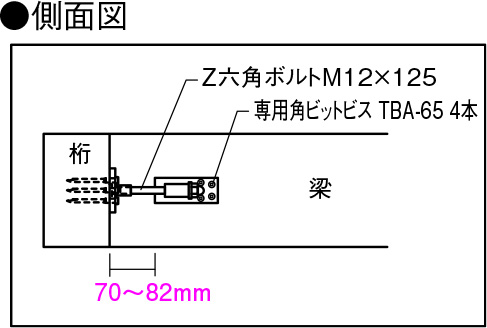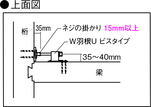 ②六角ボルトの長さに合わせて「W羽根Uビスタイプ」の位置を決め、専用角ビットビスTBA-65を梁側に4 本とめ付けてください。