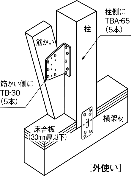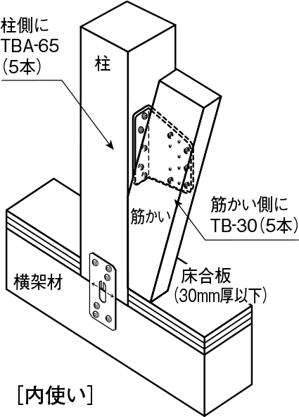 ①金物本体は、専用角ビットビスTBA-65(5本)で柱に取り付けてください。( 横架材または床合板の上端から金物までの距離は、筋かいの角度により90〜170mmの間を目安に