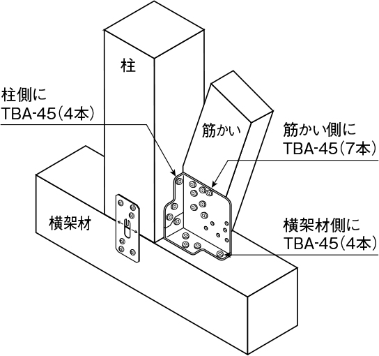 ①金物本体を専用角ビットビスTBA-45(8本)で柱と横架材に取り付けてください。