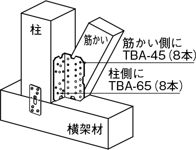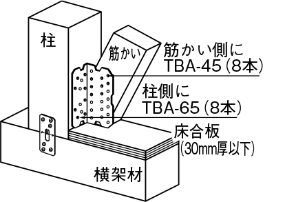 ①金物本体を横架材または床合板に突き付け、専用角ビットビスTBA-65(8本)で柱に取り付けてください。