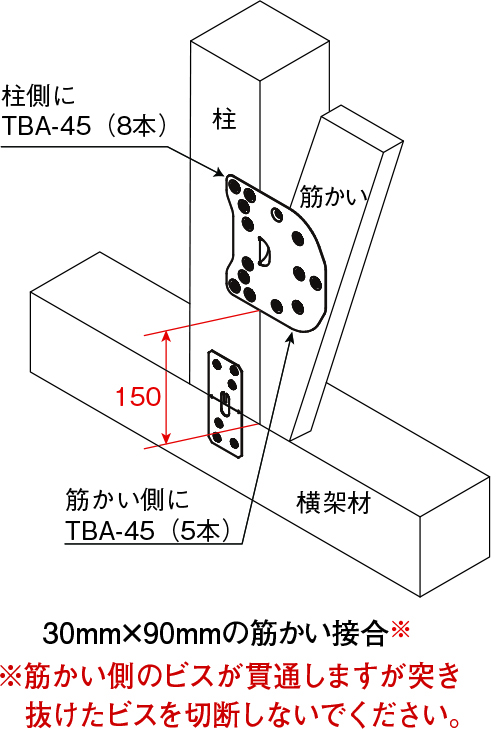 30×90の筋かいを施工した際にTBA-45のビスが突き抜けてしまいます。施工方法は合っていますか