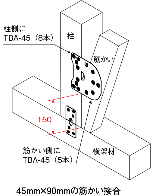 30mm×90mm以上の筋かい(壁倍率1.5倍)及び45mm×90mm以上の筋かい(壁倍率2倍)の端部を接合するときに使用します。