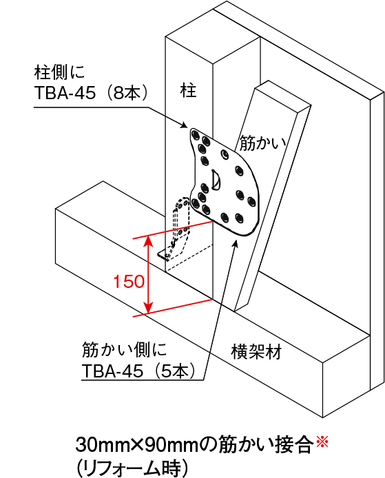 ②専用角ビットビス(TBA-45)で柱と筋かいに取り付けてください。(柱側:8本、筋かい側:5本)