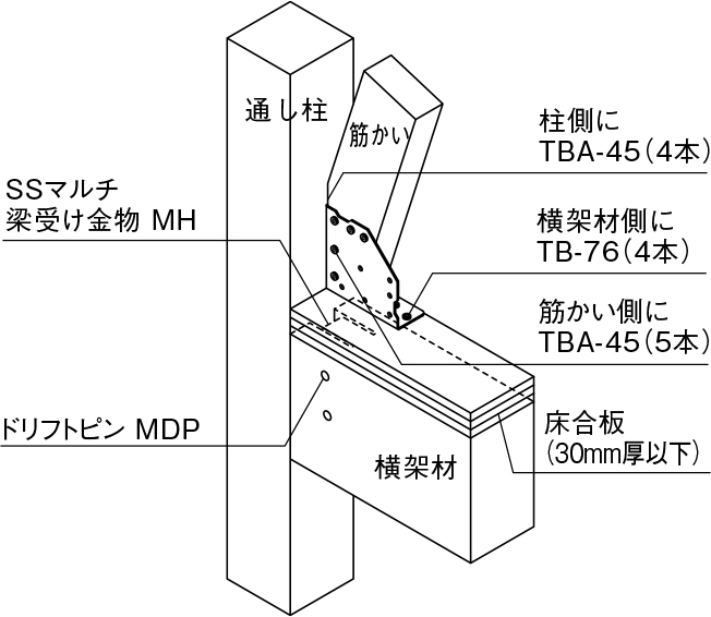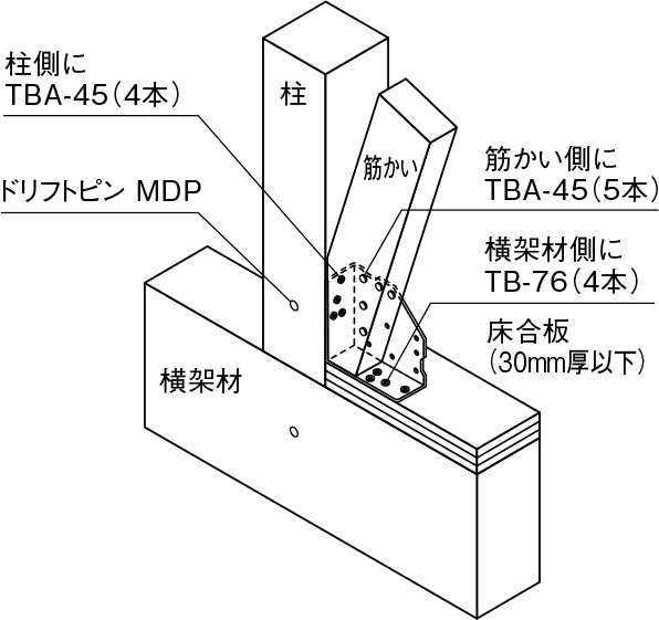 ①金物本体を床合板の上から専用角ビットビスTB-76を横架材側に4本、専用角ビットビスTBA-45を柱側に4本で、柱と横架材に取り付けてください。