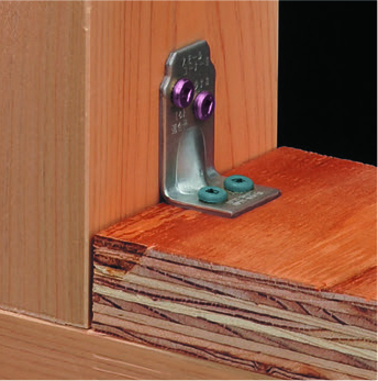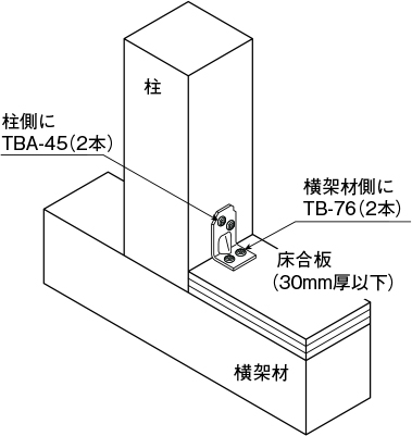 ①専用角ビットビスTB-76で横架材にとめ付けることにより、床合板を切り欠くことなく、床合板の上から取り付けが可能です(。床合板30mm厚以下)