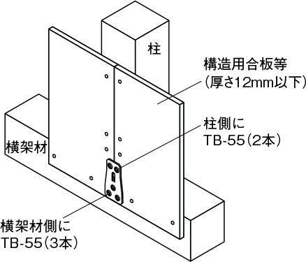 ②専用角ビットビスTB-55を柱側に2本、横架材側に3本とめ付けてください。