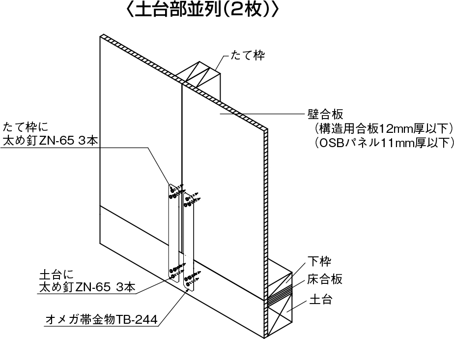 2×4工法の根太レス土台において、1階外周部のたて枠と土台、または、妻小壁たて枠と最上階たて枠の接合に使用します。