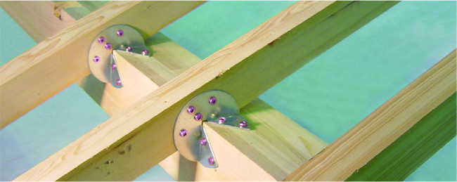 ①桁と棟木に対して垂木との交点に金物を1個、できるだけ垂木の同一側面を避けて配置します。