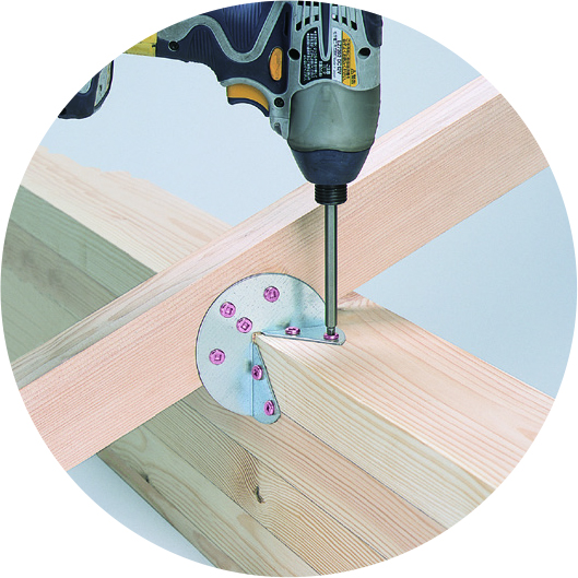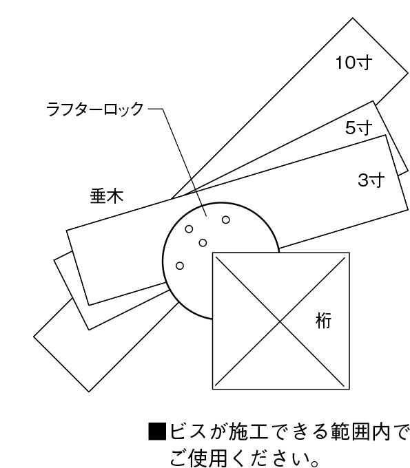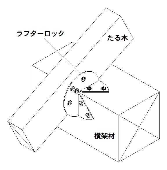 垂木と棟木の接合にラフターロックを取り付ける場合には、垂木の割れを軽減する目的で垂木上端から棟木に向かって別売の補強用ビス(構造用Vカットビス)を施工した後にラフターロックを取り付けてください。(任意)