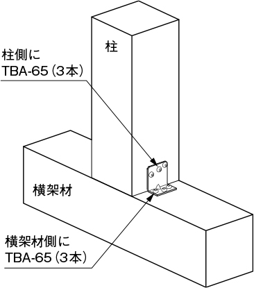 ②専用角ビットビスTBA-65を横架材側に3本、柱側に3本とめ付けてください。