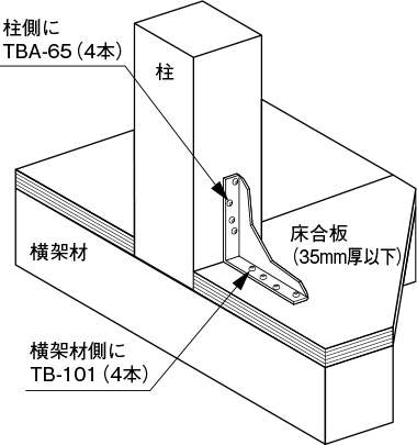 ①専用角ビットビスTB-101で横架材にとめ付けることにより、床合板を切り欠くことなく、床合板の上から取り付けが可能です。( 床合板35mm厚以下)