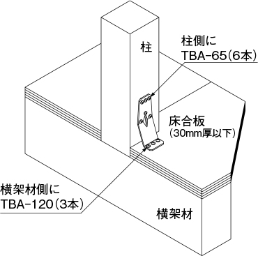 ②専用角ビットビスTBA-120を横架材側に3本、専用角ビットビスTBA-65を柱側に6本とめ付ける。