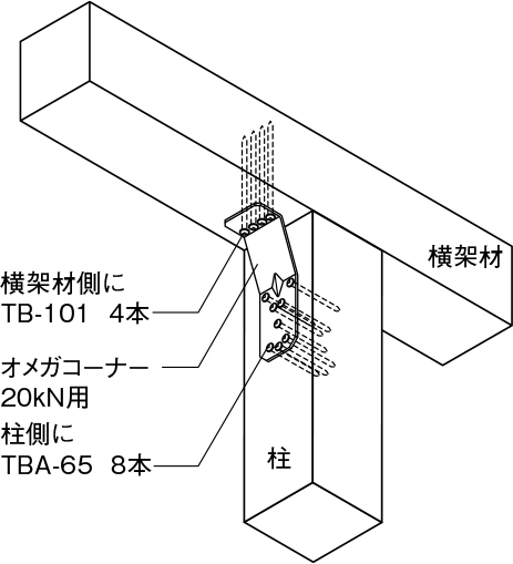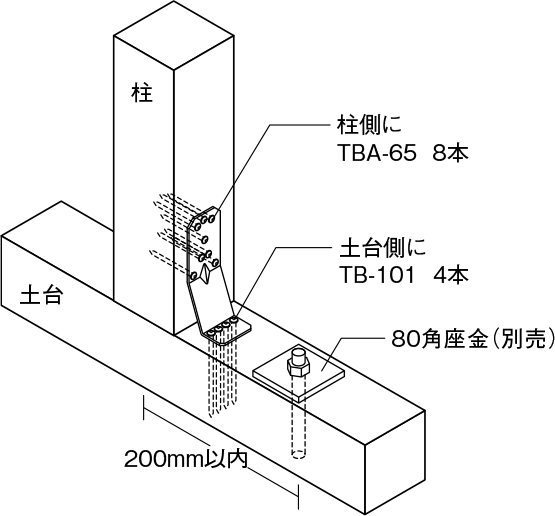 ②専用角ビットビスTB-101を横架材側に4本、専用角ビットビスTBA-65を柱側に8本とめ付けてください。