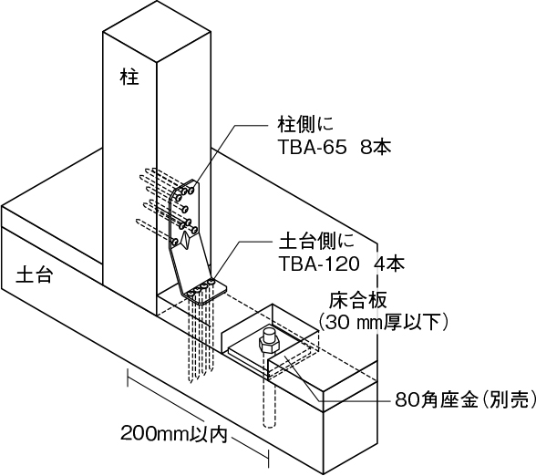 ①専用角ビットビスTBA-120で横架材にとめ付けることにより、床合板を切り欠くことなく、床合板の上から取り付けが可能です。(床合板30mm厚以下)