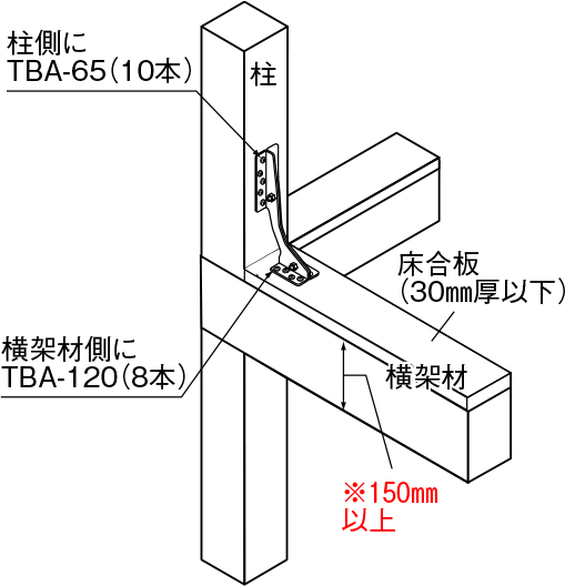 ④専用角ビットビスTBA-120を横架材側に使用することで、床合板を切り欠くことなく、床合板の上から取り付けが可能です。(床合板30㎜以下)
