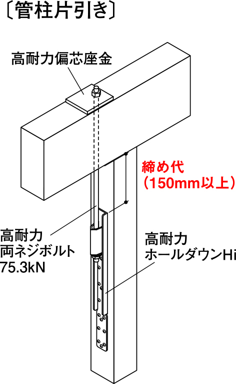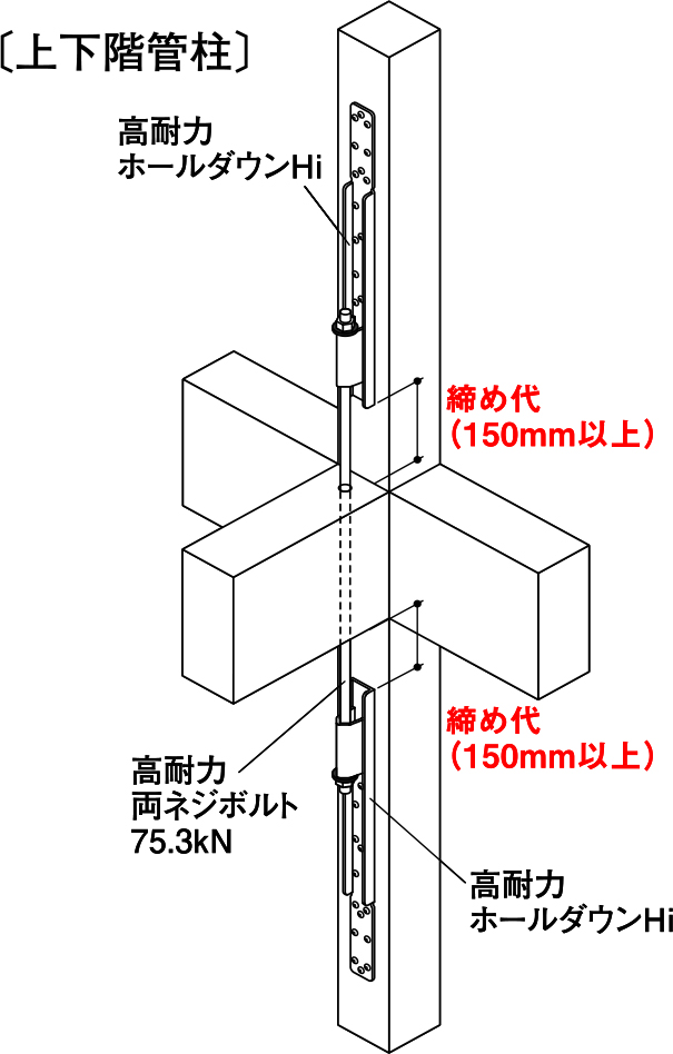 1階柱頭以上には「高耐力両ネジボルト75.3kN」及び「高耐力偏芯座金」をご使用ください。