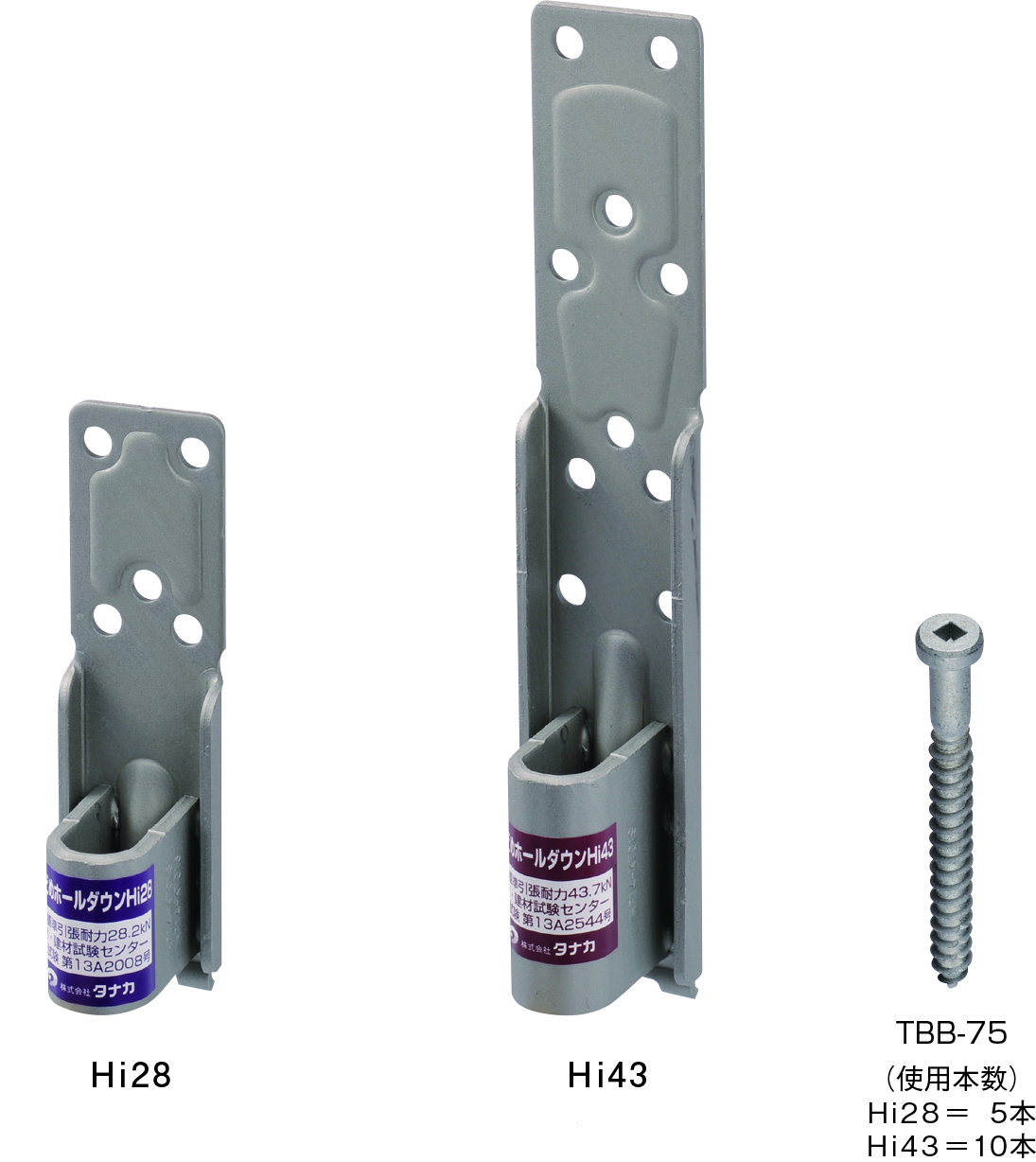 ①Hi28は28.2kN、Hi43は43.7kNまでの柱の引き抜き耐力に対応するホールダウン金物です。