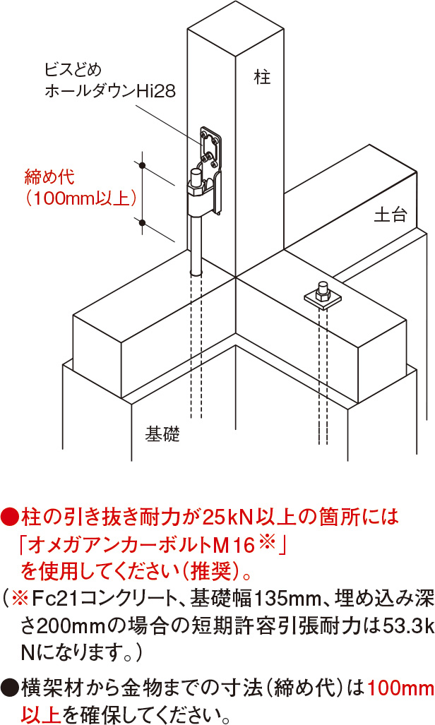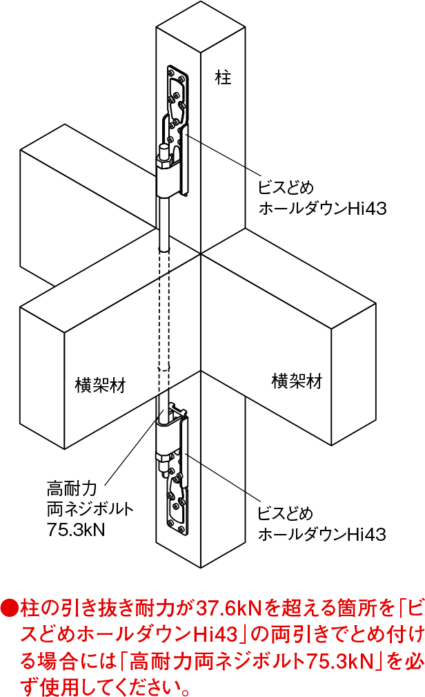 - 柱にパネル枠材(45mm厚以下)を介する場合は、「枠材用ビスどめホールダウンHi」をご使用ください。