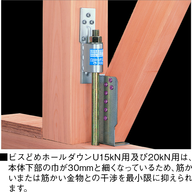 U字型ホールのクリアランスにより使い易くカラーシールで耐力確認が一目でわかる定番のビスどめホールダウン金物です。