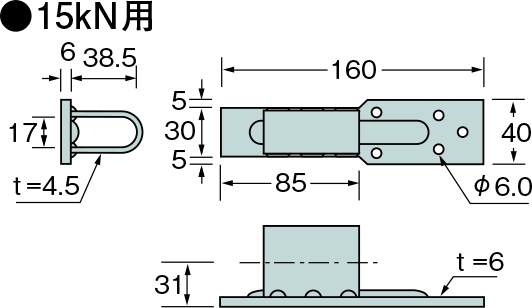 | 15kN用 | 40×160×6.0(t) | AF404600 | 30個 | 専用角ビットビス TBA-65(150本) M16用平ワッシャー(30枚) | 14.8 |