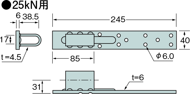 | 25kN用 | 40×245×6.0(t) | AF424600 | 25個 | 専用角ビットビス TBA-65(250本) M16用平ワッシャー(25枚) | 18.3 |