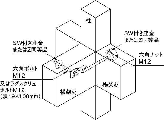 ③ラグスクリューM12(頭19×100mm)を接合具として使用できます。