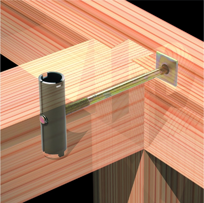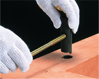 ③パイプ羽子板かくれんぼ本体をφ30mmの孔に差し込み、ツメを使って調整して、ボルト位置を合わせてください。(写真参照)