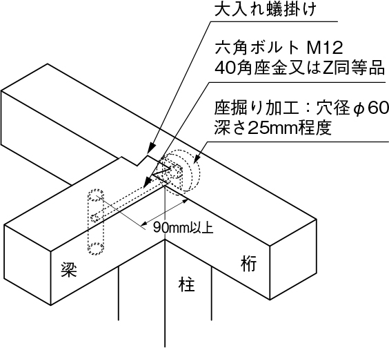 ①パイプ羽子板かくれんぼ本体の孔は、梁材に対し、ボルトの長さに合わせて桁材の面から90mm以上の位置にφ30mmの孔をあけてください。