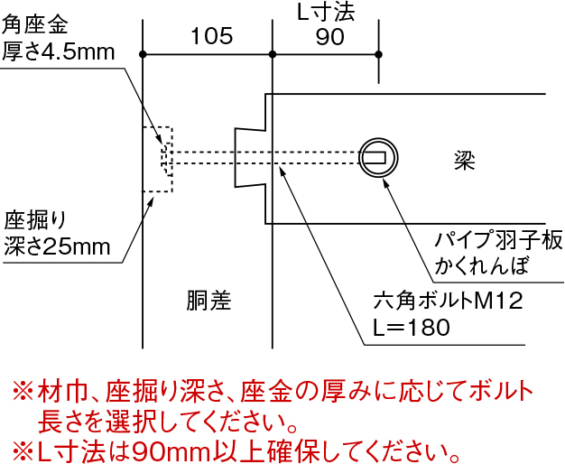 ④桁材側から座金を介して六角ボルトM12で締め付けてください。