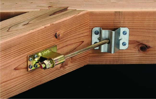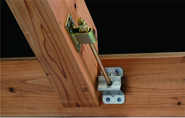 ③W羽根Uビスタイプ本体をネジ部が30mm程度出るように登り梁や斜め梁に位置を合わせて設置し、専用角ビットビスTBA-65(4本)で取り付けます。