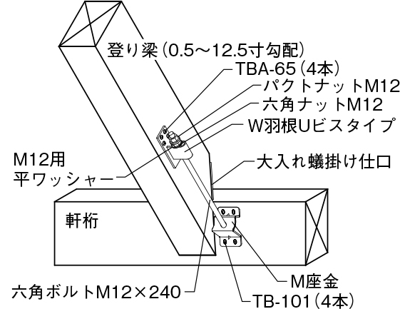 ②登り梁の0.5~12.5寸勾配に取り付けができます。