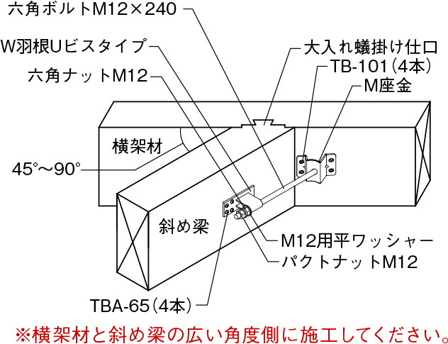 - 本製品は梁受け機能はありません。大入れ蟻掛けなど仕口加工を行った上で使用してください。