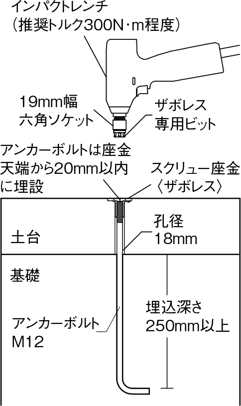 ⑤スクリュー座金〈ザボレス〉と土台上端が平らになるまで締めつけてください。ネジのかかりは15mm程度確保してください。