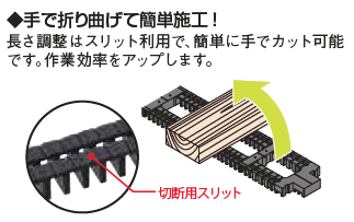 ②エコパッキン長尺は、長さ調整がスリット利用で簡単にカットできます。またスライド機構を用いて、アンカーボルトの位置調整が簡単にできます。