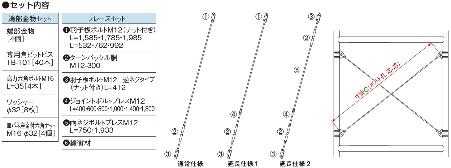 | ブレースセット | 寸法C (ボルト孔 芯-芯) | 商品コード (標準品) | ブレースの仕様 | 重量 (kg/セット) |
